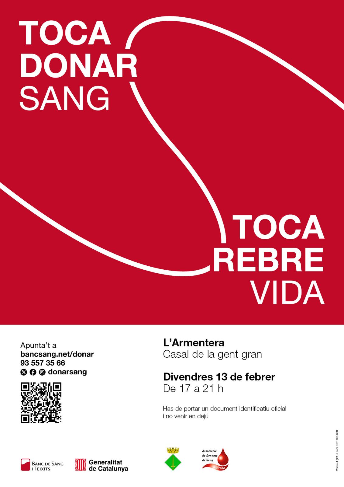 📅 Divendres 13 de febrer🕔 De 17 a 21 h📍 Casal de la gent gran Toca donar sang. Toca rebre vida.