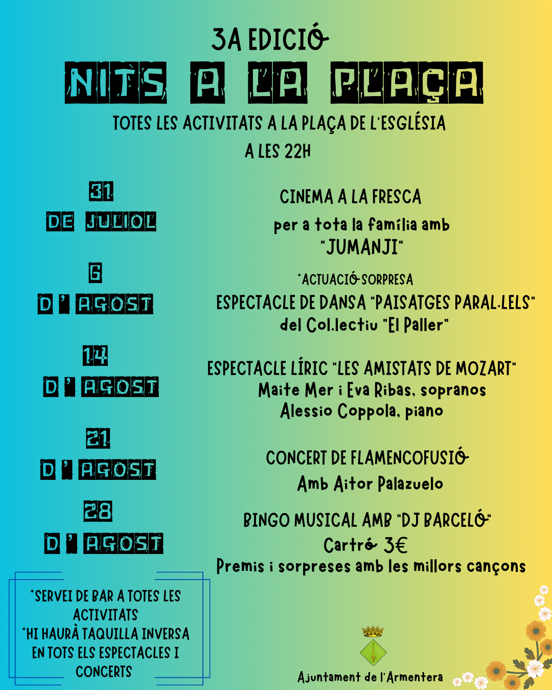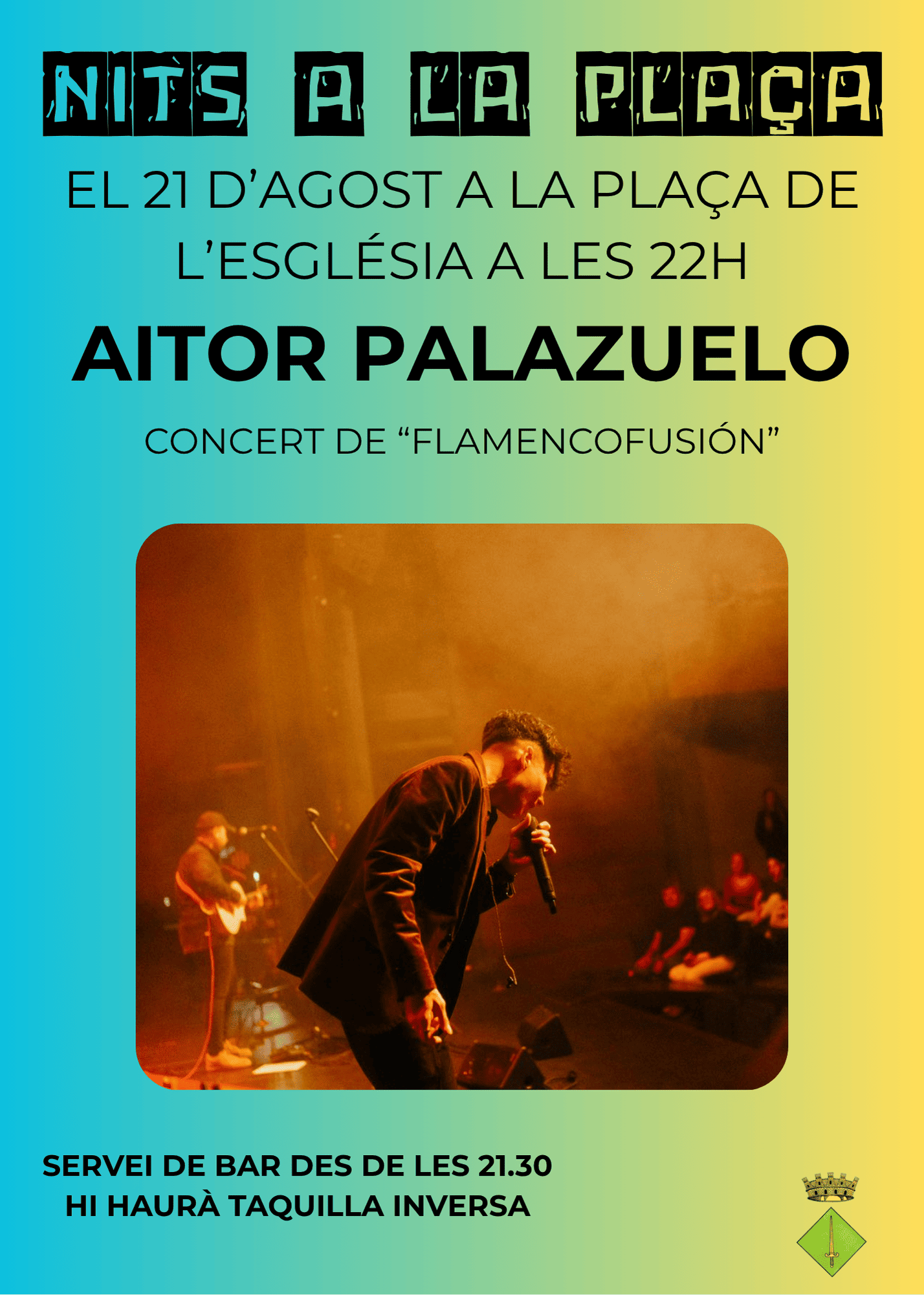 Nits a la Plaça “Aitor Palazuelo. Concert de flamencofusión” Dia 21 d’agost a la Plaça de l’Església a les 22 hores Servei de bar des de les 21.30 hores. Hi haurà taquilla inversa.