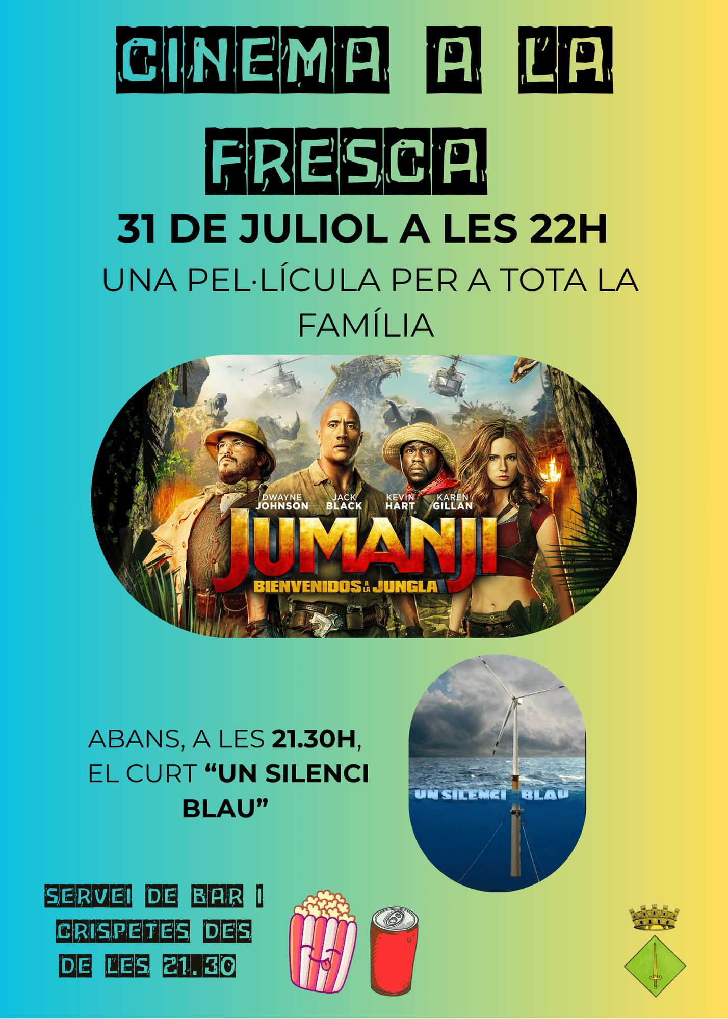Cinema a la fresca: Jumanji Dia 31 de juliol a les 22 h Abans, a les 21.30 h, el curt “Un silenci blau”. Una pel·lícula per a tota la família!