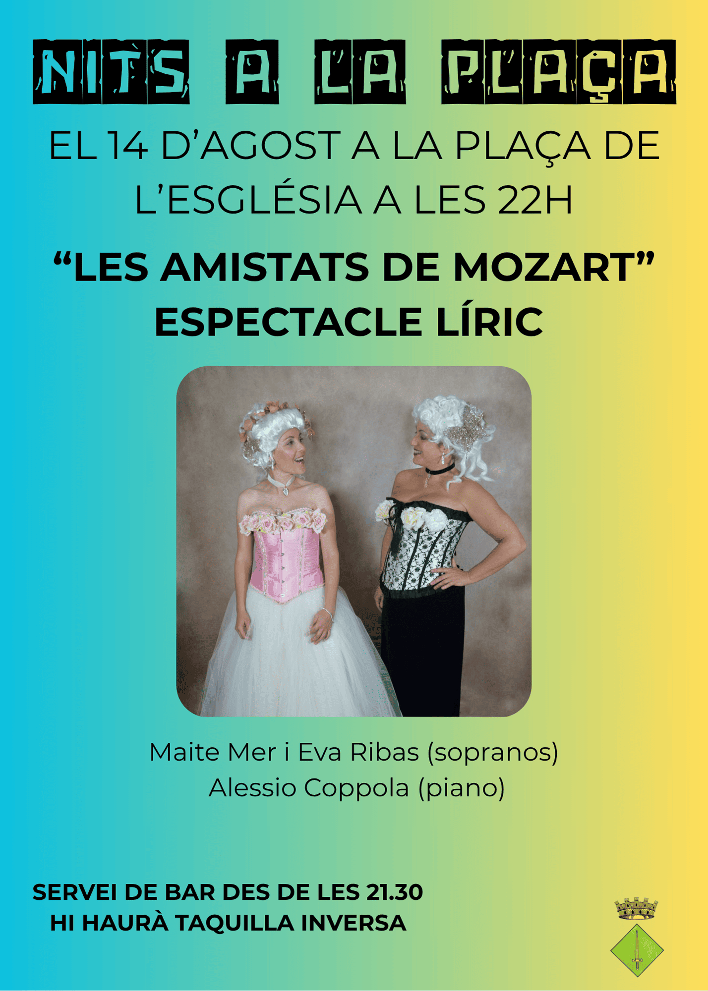 Nits a la Plaça “Les amistats de Mozart” Dia 14 d’agost a la Plaça de l’Església a les 22 hores Servei de bar des de les 21.30 hores. Hi haurà taquilla inversa.